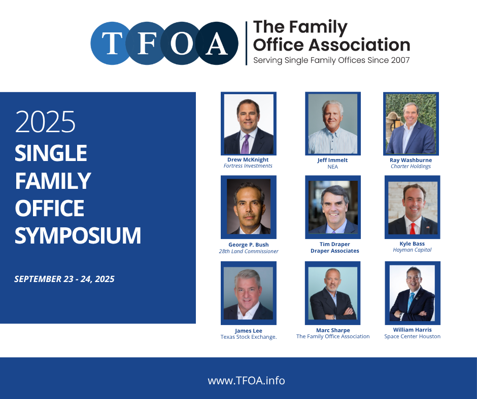 The Family Office Association (TFOA) is a global peer network that serves as the world’s leading single family office community. Our group is for education, networking, selective co-investment, and a resource for single family offices to share ideas, deal flow and best practices. Members are not actively marketing products or services to other members and no contact information or email lists will ever be shared. Since our founding in 2007, TFOA has led the global single family office community by delivering world-class educational content, unique networking opportunities, and exceptional thought leadership to our highly curated network of the world’s largest and wealthiest families. If you'd like to stay in touch on a more frequent basis, please follow us on LinkedIn and X. In the meantime, please check out our free library of family office content.